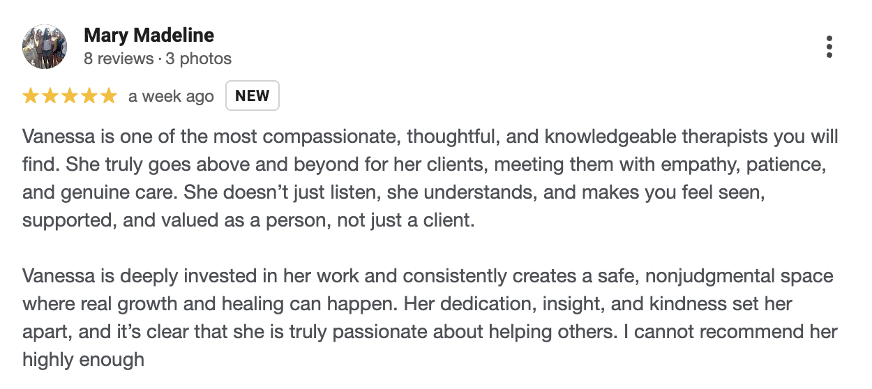 “I am committed to creating a safe and trusting environment for all clients wherein they feel seen, affirmed, respected, and free to express themselves authentically.” - Vanessa