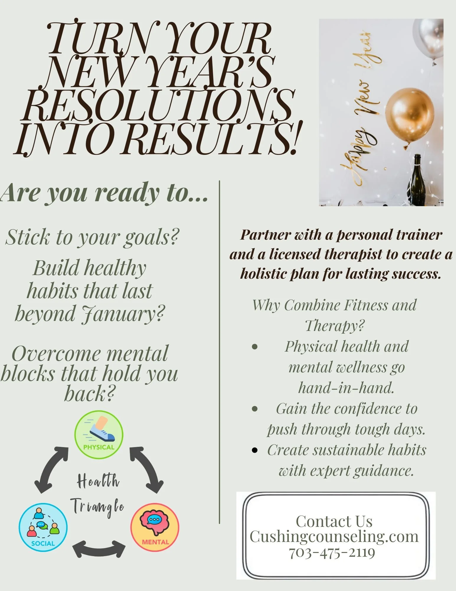 Let’s make this the year you achieve your resolutions! With the combined expertise of personal trainers and therapy support, you’ll tackle both the physical and mental challenges of staying on track.